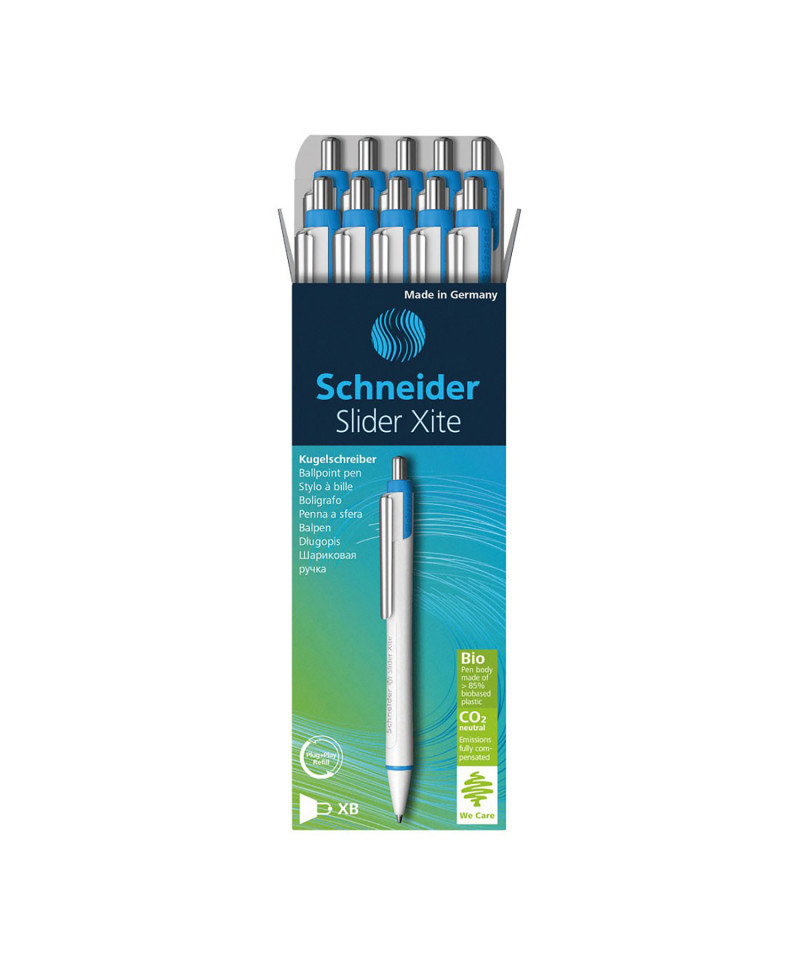 The Schneider Slider Xite XB Retractable and Refillable Ballpoint Pen features Viscoglide® technology for extraordinarily smooth, gliding writing and a barrel consisting of 90% bio-based plastics. Waterproof according to ink standard ISO 12757-2, ink dries quickly, even on smooth paper, and is smudge-proof when highlighting it later on. The wear-resistant stainless steel tip helps prevent grinding across the page and guarantees the large ink supply can be fully used without smearing. The slightly concave-shaped barrel has a sturdy metal clip and promotes tireless, relaxed writing. Compatible with the Plug+Play System, the Slider Xite can use a variety of refill formats, including the giant Slider 755 XB refill and writes with an extra broad (XB), or approximately 1.4 mm line width. The ink color is recognizable at the top of the push button. The Slider Xite is produced CO2 neutral. Includes box of ten (10) blue ink pens.
