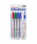 Accentuate and create beautiful outlined effects with the fine point DecoColor® Outliner. You get two colors with one stroke. Silver metallic paint with colored outline of either red, blue, green, or violet. Great for hand lettering, doodling, greeting cards, and initiations. Works best on uncoated card stock, light or white copy/printer paper, and crafting paper. Each pack includes 4 markers: red/silver, blue/silver, green/silver, and violet/silver.