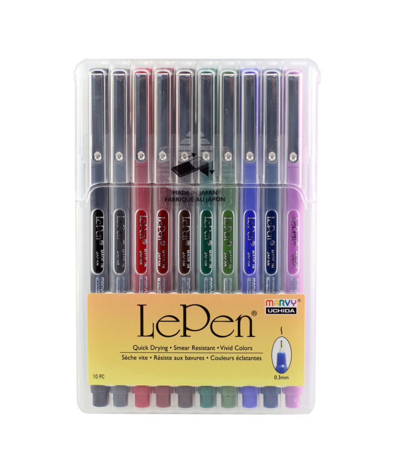 The LePen has a smooth writing micro-fine plastic point and a sleek barrel design. The ink is acid free and non-toxic. This is a 10 piece Dark Color set. Good for business forms, notebooks, diaries, memo pads, letters, journals, yearbooks, and scrapbooks. This set includes 1 each color black, red, blue, green, brown, lavender, olive green, dark grey, burgundy, and oriental blue.