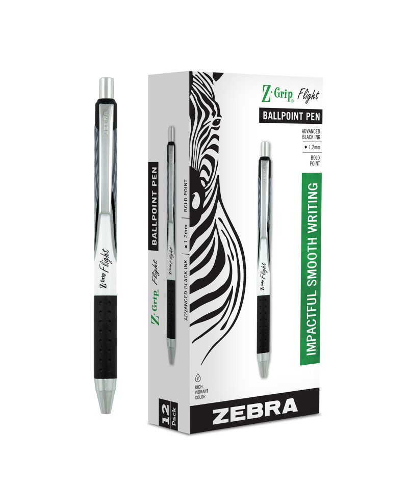 Zebra Pen's Z-Grip Flight Retractable Ballpoint Pen gives you the smoothness of a gel but dry time of a ballpoint. The low viscosity ink translates into a smooth writing experience. Nurses, teachers, sales professionals and those who write heavy will enjoy the perfect amount of bold with the 1.2mm point tip. The perfect entry level pen, Z-Grip Flight combines style, performance and value. Dark, rich ink from a bold point makes this pen a reliable choice for heavy note-taking and correspondence. Metal clip provides a secure clasp onto notebooks and pockets. Write on both sides of the page without worrying about the ink bleeding through to the other side. Its chic, stylish design has a plastic barrel to match the ink, making it easy to find the pen you want at a glance. Each pack includes 12 pens.