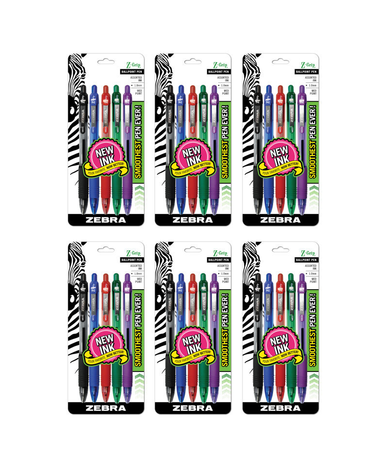 Grip color corresponds to ink color. Each pack includes 5 pens. Sold as 6 packs for a total of 30 pens.