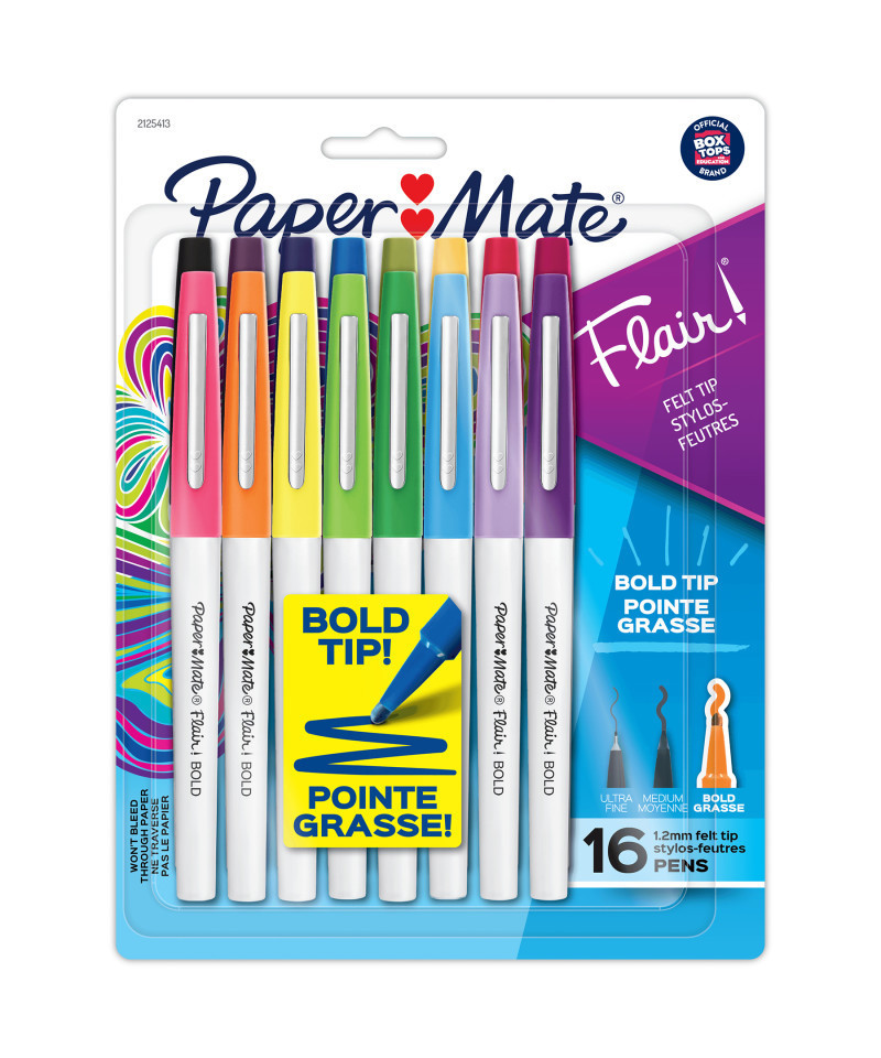 Go bold and make your creativity stand out with bold tip Paper Mate Flair Felt Tip Pens. When it comes to writing, doodling, coloring, and journaling, Flair Bold's durable 1.2 mm tip will leave a vivid impact. With vibrant ink that won't bleed through paper, your work will stay looking clean and fresh. Available in a range of smear- and fade-resistant iconic ink colors, Paper Mate Flair pens are a favorite in classrooms and homes. Pack of 16.