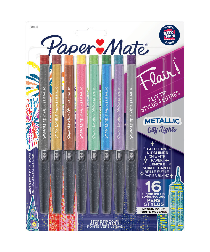 Bring a blast of metallic sparkle to your writing and illustrations with Paper Mate Flair Pens! Featuring metallic felt tip pens with glittery ink that shines on white paper, the City Lights theme pack brings even more fun to your writing, doodling, and bullet journaling. Featuring smear- and fade-resistant ink, Paper Mate Flair Pens always leave a great impression. The vibrant ink is also specially designed to not bleed through paper, keeping your work looking clean and fresh. Finally, the medium point (0.7 mm) writes in bold, colorful lines. Boost your writing fun-factor with Paper Mate Flair! Pack of 16.