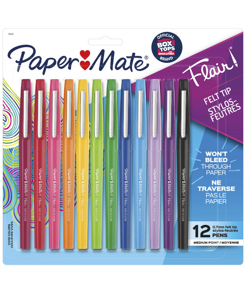 Boost your writing fun-factor with Paper Mate Flair Felt Tip Pens! With a rainbow of bright colors and smear-resistant ink that won't bleed through the page, these colored pens make writing a blast. The medium point (0.7mm) writes in bold, colorful lines so your self-expression makes a major statement. The best part of all? Everything you can create—whether you're taking notes, drawing, doodling, or doing anything else that inspires you. With Flair Pens, there's no limit to your fun. Pack of 12.