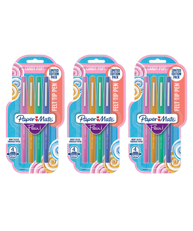 Turn everyday writing into eye candy with the Paper Mate Flair Pens, limited edition Candy Pop pack! Scrumptious candy-inspired shades plus smear-resistant ink that won't bleed through the page combine to give all your drawings, doodles and projects a pop of indulgent color. Flair pens have a medium point (0.7mm) that writes in bold, colorful lines along and a Point Guard that prevents the tip from fraying. Treat yourself to bold, fun, excitingly sweet sketching and writing with Paper Mate felt tip colored pens. Each pack includes 4 pens. Sold as 3 packs for a total of 12 pens.