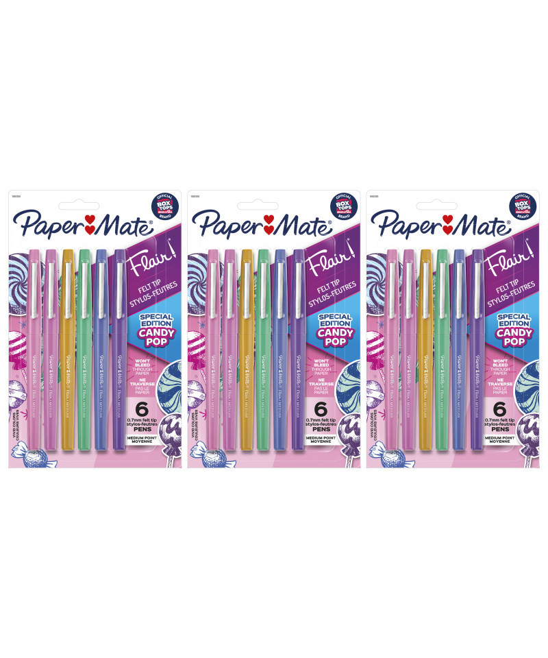 Turn everyday writing into eye candy with the Paper Mate Flair Pens, limited edition Candy Pop pack! Scrumptious candy-inspired shades plus smear-resistant ink that won't bleed through the page combine to give all your drawings, doodles and projects a pop of indulgent color. Flair pens have a medium point (0.7mm) that writes in bold, colorful lines along and a Point Guard that prevents the tip from fraying. Treat yourself to bold, fun, excitingly sweet sketching and writing with Paper Mate felt tip colored pens. Each pack includes 6 pens. Sold as 3 packs for a total of 18 pens.