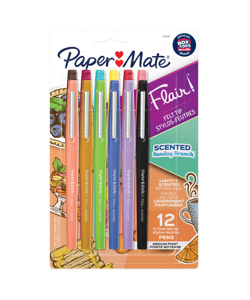 Delight your senses with the smell of sweet Sugared Grapefruit and rich Hazelnut Latte with Paper Mate Flair Scented Sunday Brunch-Themed Pens. The same vivid Flair colors you know and love with a lightly added scent! With 12 scents and colors inspired by Sunday Brunch, these Flair pens will transport you to your favorite meal as you write, color, and doodle. Flair pens won't bleed through paper and feature Point Guard technology and smear-resistant ink so your work stays neat. Order up the fun of Sunday Brunch for your bullet journaling, adult coloring, note taking, and more, with Paper Mate Flair!