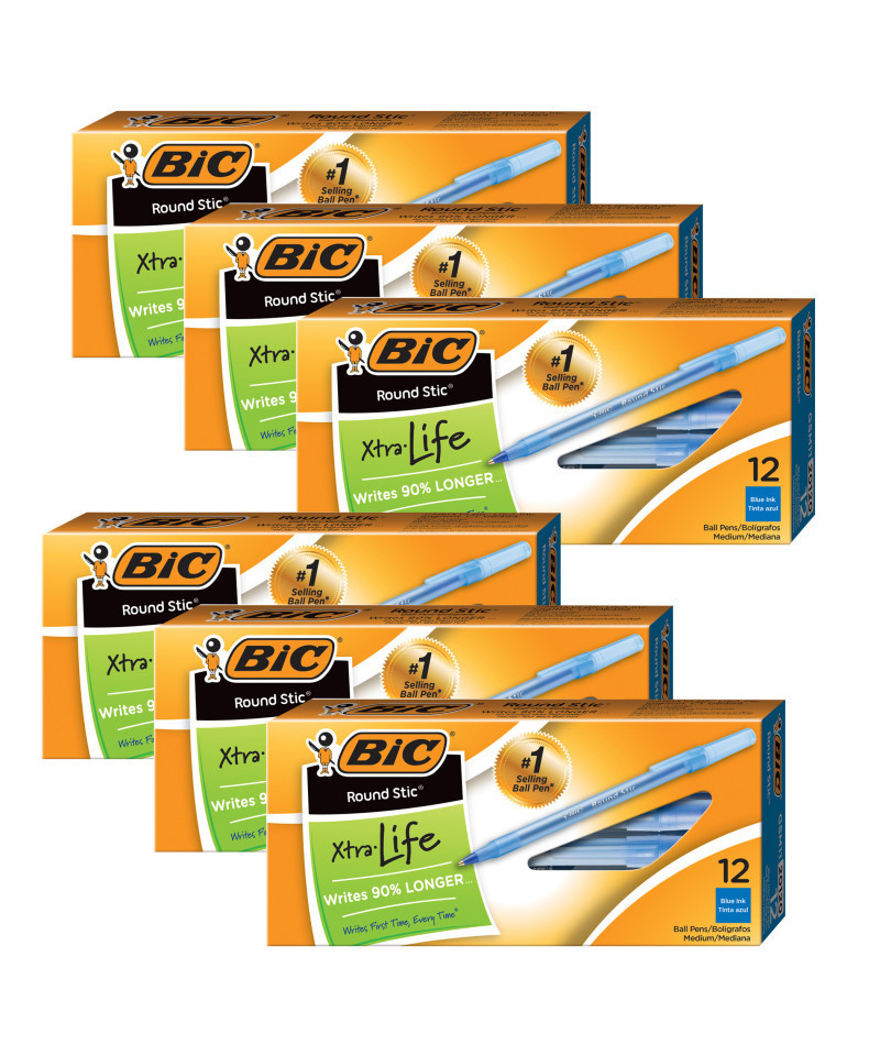 BIC® Round Stic® pens are a lightweight round barrel pen for comfortable writing. Tough, durable tungsten carbide point insures the smoothest of writing. Features a medium point and the cap and end plug color indicate the ink color. It is easy to identify and is designed for long-lasting dependability. Features a ventilated cap and tungsten carbide ball. Each pack includes 12 blue pens. Sold as 6 packs for a total of 72 pens.