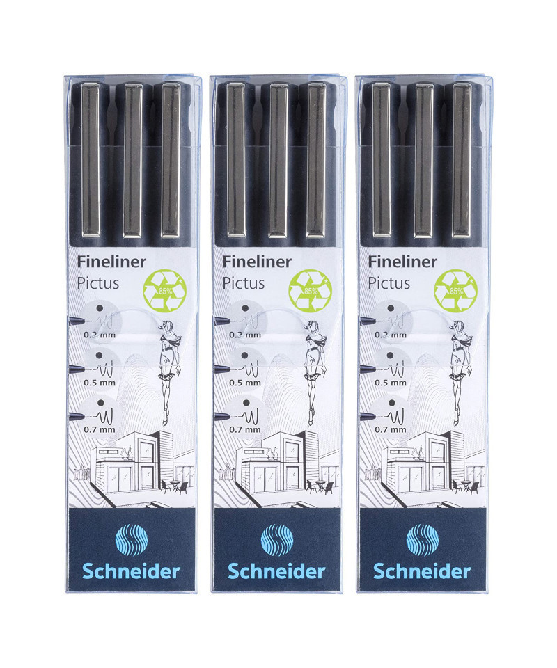 Technical illustrations or simply for sketching and writing at home or at school, the new fineliner Pictus qualifies for all these applications. Its water based, pigmented ink guarantees long lasting bright colors and an excellent resistance to fading. The ink is waterproof according to ink standard ISO 14145-2. Its metal encased writing tip stands for durability and precise layouts. Pictus is the ideal writing instrument for drawing, sketching, illustrating and writing as well as for working with rulers and stencils. At Schneider sustainability is one of the main priorities thus the pen body of the fineliner Pictus is made of at least 85% recycled plastics. Pictus, a real all-rounder. Each pack includes 3 Pictus Fineliners, one 0.3mm, one 0.5mm, and one 0.7mm. Sold as 3 packs for a total of 9 Pictus Fineliners.