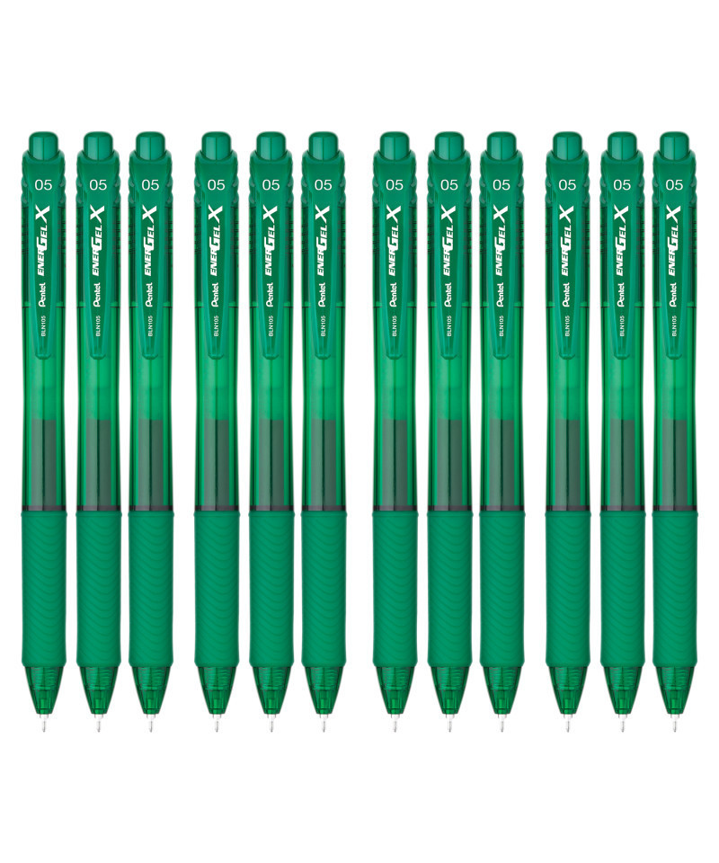The Pentel® EnerGel-X retractable gel pen provides a smooth, effortless writing experience at a great price. High performance ink technology combines the best qualities of liquid and gel ink, and dries so fast even left handers love it - no smears, no smudges, no globs. Stylish barrel colors match the ink inside for quick and easy color selection. The latex-free grip provides extended comfort and control when writing. It is available with a 0.5mm needle tip that writes fine lines and is refillable with any size and/or color of ENER-GEL refill. Each pack includes a pack of 12 green pens.