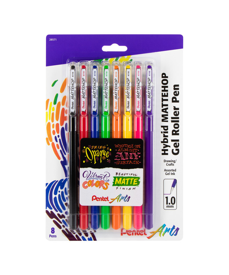 Pentel Arts Hybrid MATTEHOP Gel Roller, 1.0mm, Matte A/B/C/D/F/G/P/V Ink, Pack of 8