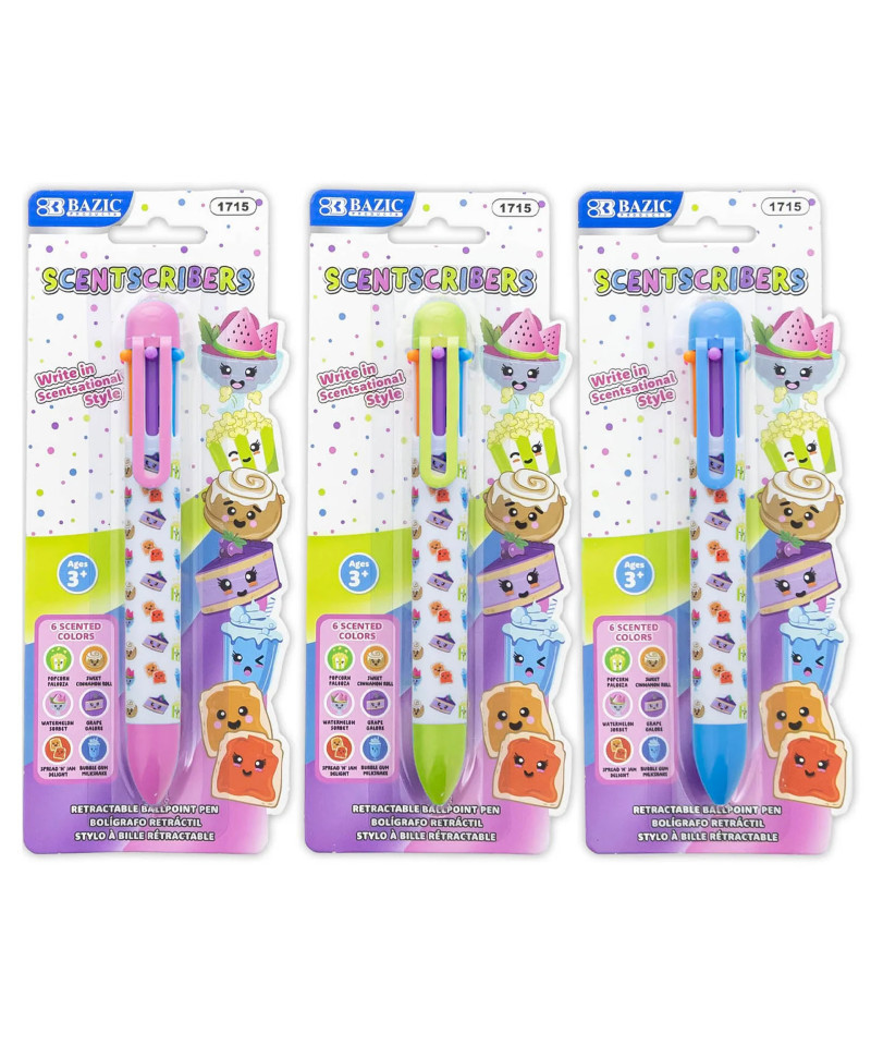 Add a burst of color and a hint of fun to your writing with these Scented 6-Color Pens! Each pen includes 6 vibrant, scented ink colors that make note-taking, journaling, and drawing a more enjoyable and engaging experience. The retractable design allows you to effortlessly switch between colors with a simple click—no caps to lose, no mess to clean. With a bold 1.0mm tip, these pens create clear, vivid lines that stand out on any page, while the smooth-flowing ink ensures a consistent, skip-free writing experience. Perfect for school, work, or creative projects, these multi-color scented pens combine functionality, color, and a touch of fragrance all in one. Assorted scents include: Light Green = Coconut, Pink = Watermelon, Red = Peanut Butter, Orange = Cinnamon, Purple = Grape, and Light Blue = Bubble Gum. Sold in assorted pen designs, no design choice. Sold as a pack of 3.