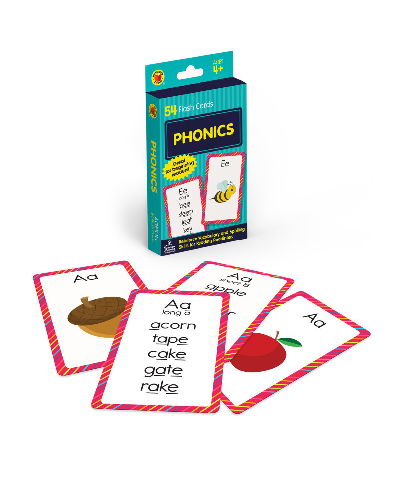 Carson Dellosa's Phonics Flash Cards present an easy fun way kids to practice essential skills. This 54-card set includes 52 cards that feature essential phonetic sounds like consonants, blends, more, as well as a picture cues word representation each sound. A list of words that also fit with phonetic sound being taught can be found on reverse side of each card. This flash card set also includes a bonus game card additional learning fun. Flash cards allow kids to develop critical thinking, decision-making, turn-taking, other skills while allowing them to learn a fun, hands-on way.