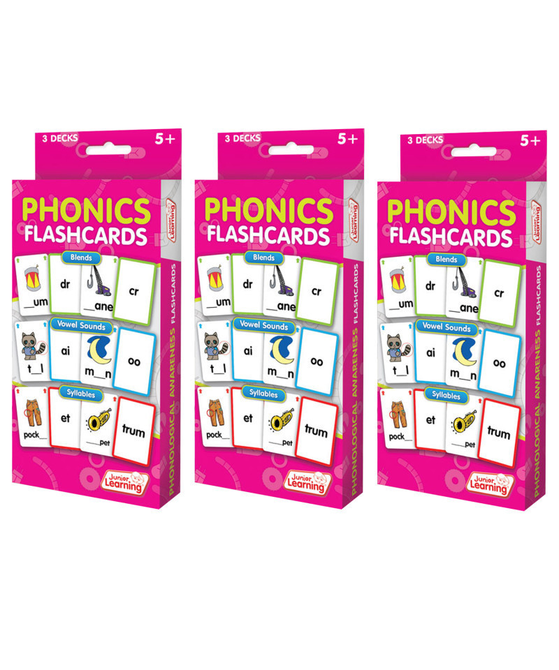 Phonological Awareness Flash Cards: Blends, vowel sounds and syllables. Each pack includes 3 flash card sets (162 cards). Ages 5+. Sold as 3 packs for a total of 486 cards.