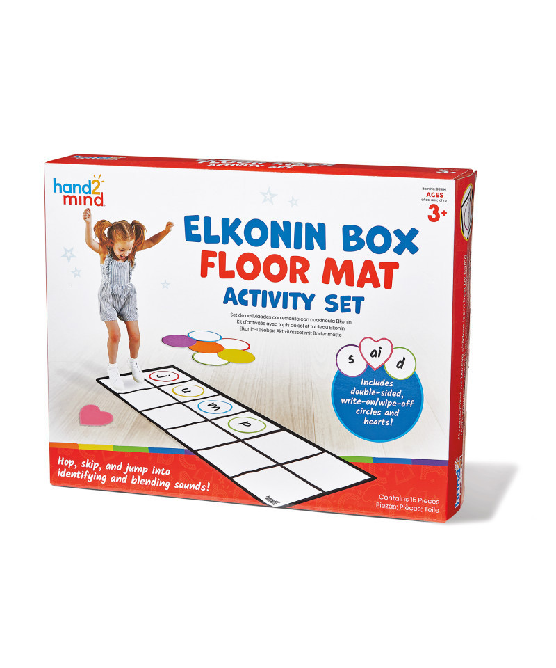 Hop, skip, or leap into reading with the Elkonin Box Floor Mat Activity Set! Students will love practicing early literacy skills and building phonemic awareness by moving their feet as they learn to connect the sounds in words to letters (orthographic mapping). The mat features an Elkonin Box and accommodates words with up to 6 sounds. Elkonin boxes—also known as sound boxes—allow students to segment words into individual sounds, or phonemes. Colorful circles and hearts allow students to identify, find, and manipulate sounds, segment words into phonemes, and take a hands-on approach to translating written words into speech. Provide a multisensory, kinesthetic approach to literacy that prepares students to become confident readers and spellers. Getting started guide includes 4 activities and a word list. Includes 1 6-Sound Elkonin Box Floor Mat, 12 Write-on/wipe-off Circles, 2 Write-on/wipe-off Hearts, and 1 Activity Guide.