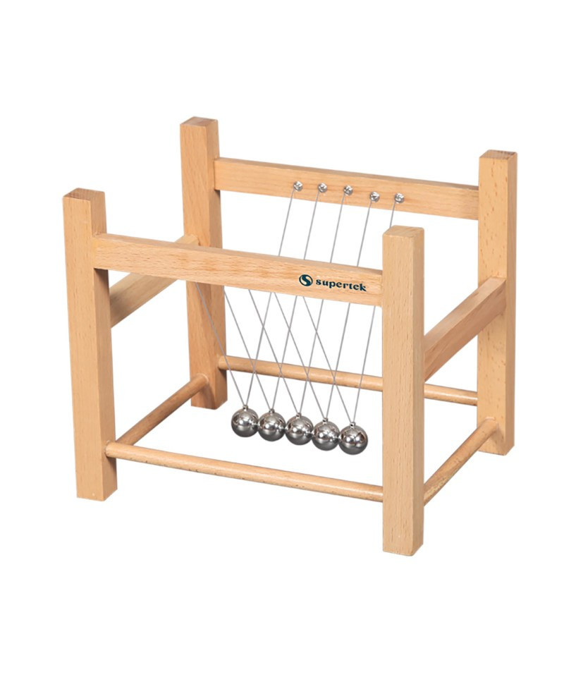 This Newtonian Demonstrator is a large size to clearly explain the theory. Wooden frame consists of five nickel plated steel balls of uniform mass suspended from the frame. Includes instructions. Size: approx. 9″ L x 7″ W x 8″ H.