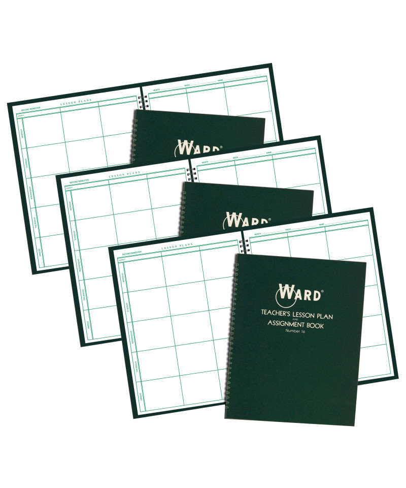 Ward books are as durable as they are functional, featuring the heavy, dark green cover material that users have come to rely on in WARD products. All WARD LESSON PLAN BOOKS are printed in green ink on quality white paper and bound in a durable, deep green cover. Semi-concealed wire binding allows the book to open flat for easy use. Page size 8-1/2 x 11. All books contain a yearly schedule of school events, seating charts, and memorandum sheets. Six period plan book covering a school year up to 38 weeks. Each week divided into a five day week with 6 periods per day. Sold as 3 identical books.