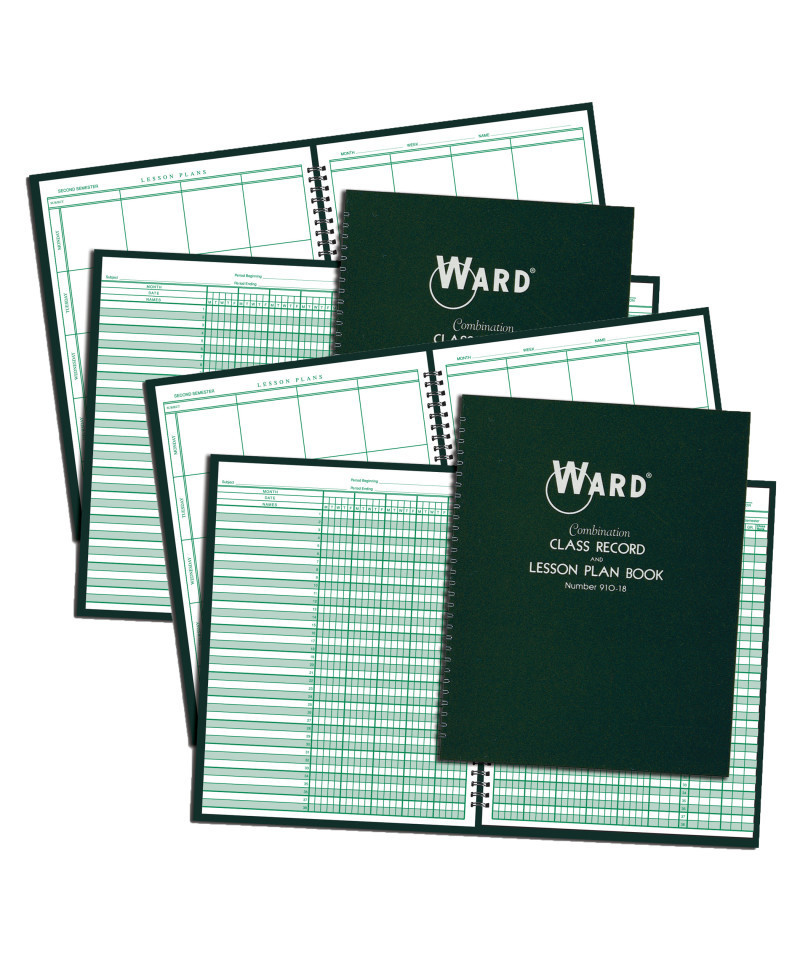 Ward Combination Class Record Book/Lesson Plan Book includes 9-10 week grading period with 38 student names per page. Four grading periods with grading sheets for 36 to 40 weeks of school and 16 classes per year. Eight period plan book covering a school year up to 40 weeks. Each week divided into a five day week with 8 periods per day. Includes memorandum sheets and seating charts. Sold as a pack of 2 identical books