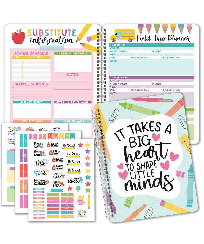 - Stay organized in style! you'll receive an 8x10 inch teacher planner with 12 undated monthly sections, each with space for five weekly plans per month. Plus, you'll get 3 sticker sheets, 1 substitute sheet, 1 field trip planner, 2 daily schedules, 2 student info sheets, 2 important dates sheets, 1 year review