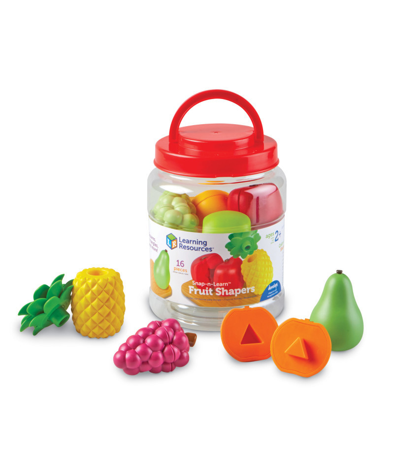 Dig into this preschool skill-building fruit fiesta! Whether they're learning in the classroom or through homeschooling, toddlers learn new shape and color skills every time they snap with this set of Snap-n-Learn Fruit Shapers from Learning Resources. An imaginative entry in our popular Snap-n-Learn line of preschool toys, these fun two-piece fruits come with a cool snap-apart, push-together action that helps little hands build essential coordination and other fine motor skills. You can even make up your own fine motor game or learning activities! The skill-building fun doesn't end there, though—inside each of these fruits, you'll find unique color and shape pegs that build color recognition, patterning, and shape sorting skills with every playtime! This set of Snap-n-Learn Fruit Shapers from Learning Resources also boosts early vocabulary skills—kids can identify the set's pineapple, orange, apples, grapes, and pears! When playtime is over, these toddler toys store in the sturdy plastic bucket for quick and easy cleanup.