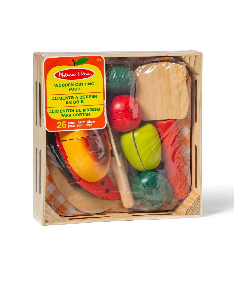 This wooden play food set is perfect for young chefs looking to explore a little mealtime fun--without the mess! It includes eight pieces of wooden food that can be sliced into 27 sections, a cutting board, and a wooden knife. Cutting the food makes a satisfying "crunch"--and provides a playful introduction to concepts of "whole," "part," and fractions.