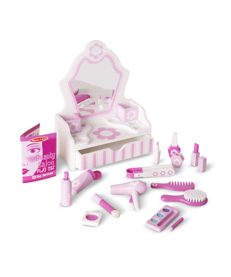 Add glamour and style to playtime with these wooden beauty essentials for make-believe makeovers! The 18-piece set includes a sturdy white and pink vanity with mirror and storage drawer. The wooden pieces include a hair dryer, hair spray, hair straightener, flip-top lotion bottle, lipstick, two nail polish bottles, blush, makeup brush, eye shadow and applicator, comb, and brush. A reusable spa services card lets kids three and older get the full salon experience by customizing makeovers for themselves, friends, stuffed animals, and dolls!