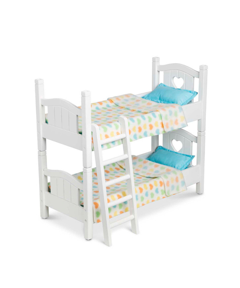 Tuck in favorite dolls and stuffed animals for bedtime or sleepovers with this realistic and classically styled wooden bunk bed that suits any décor! Made to fit dolls up to 18 inches tall, these two durable white beds with a wipe-clean surface can be used side by side or stacked to stand approximately 17 inches tall. The set includes two mattresses, two blankets, two pillows, and a movable wooden ladder. Clear instructions make the beds easy to assemble with just a screwdriver (not included). Mine to Love® dolls and accessories encourage empathy and help kids express themselves as they explore grown-up roles and responsibilities. A child's confidence and self-esteem blossom and grow with each nurturing moment of imaginative play!