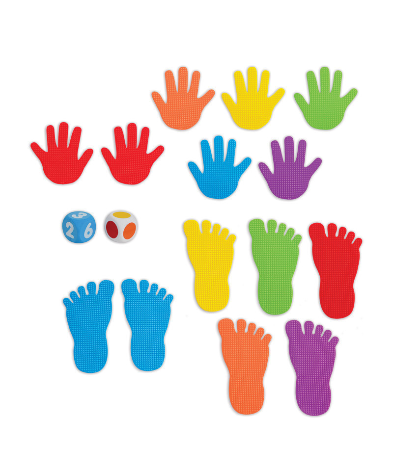 - Set of 24 pieces including 12 hands and 12 feet in durable, non-slip, flexible plastic. 6 pairs (left and right) of each in 6 colors: red, green, blue, yellow, orange and purple. Includes 2 foam dice with numbers and colors.