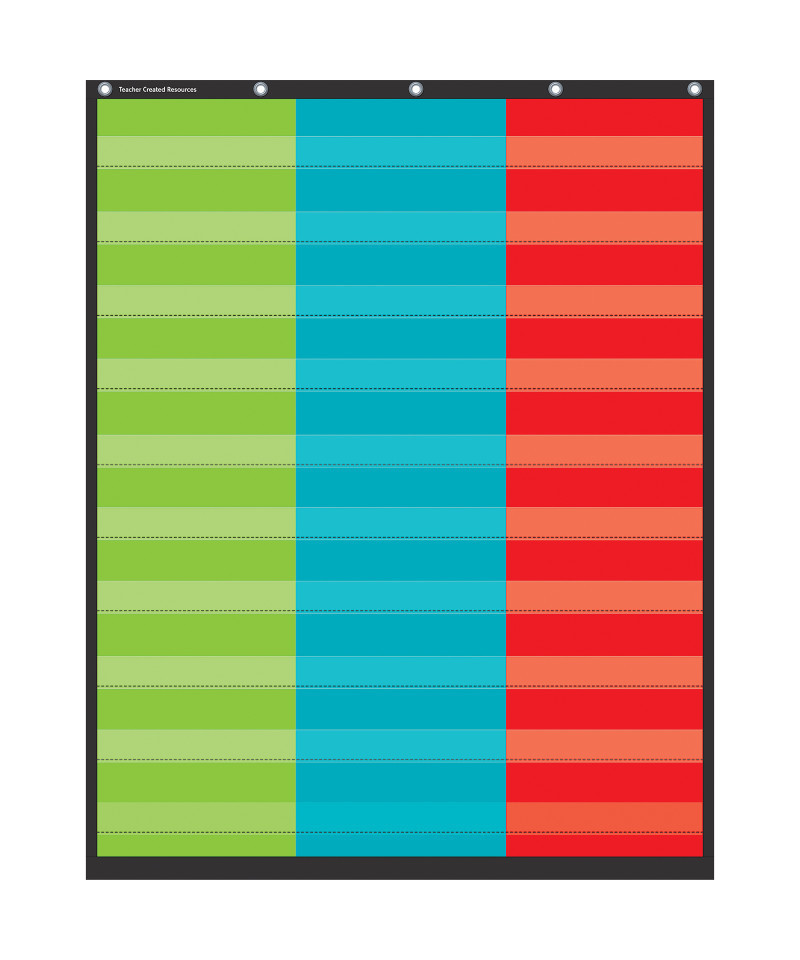 This lightweight and durable 3 Column pocket chart features a colorful design and hangs easily from sturdy, metal grommets. Measures 34" x 44". Use it as a classroom behavior chart or for organizing and categorizing classroom information. Perfect for KWL activities, word walls, identifying word parts, showing cause and effect, and more! The non-porous surface is easy to clean and can be wiped-down or sprayed with disinfectant to help prevent the spread of germs. Measures 34" x 44".