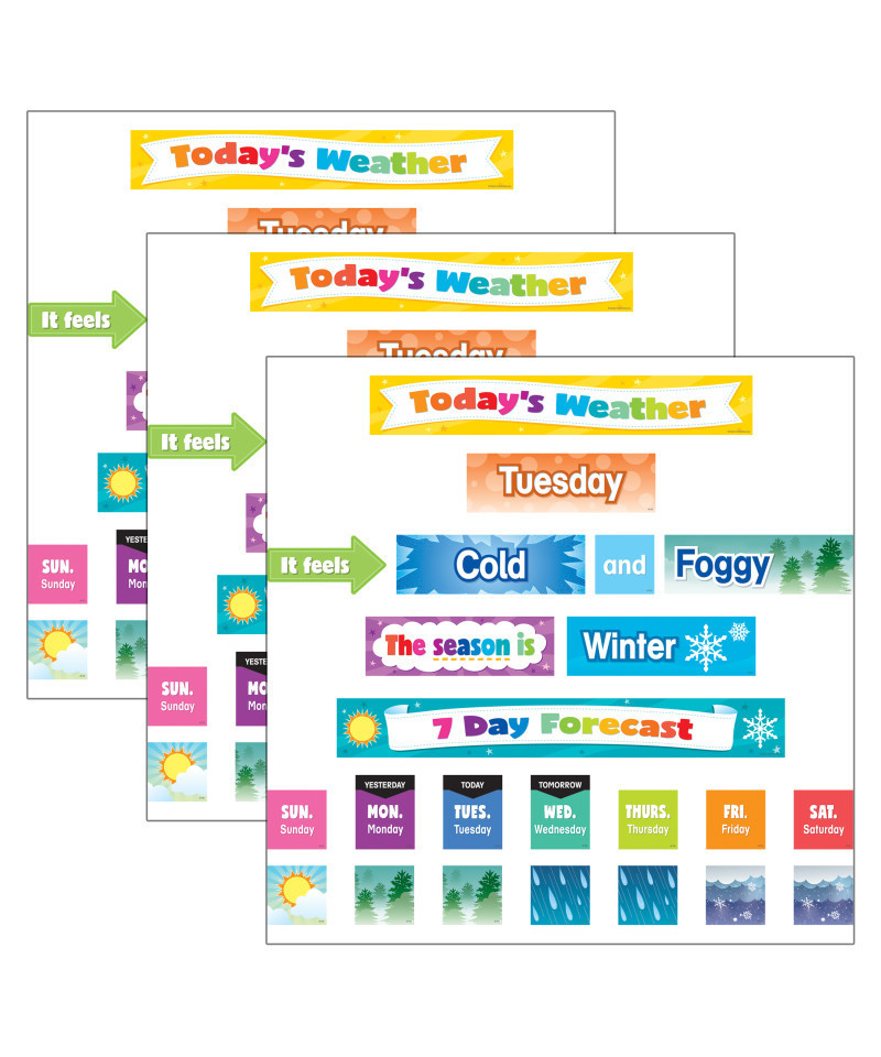 Weather pieces can fit into most pocket charts. Great way for students to learn about the weather. Great for any daycare or classroom setting. Each pack includes 94 total cards: 24 days of the week, seasons, and weather cards (8-3/4" x 2-3/4"), 1 "It feels" arrow (5-1/2" x 2-3/4"), one 7 Day Forecast header (20-3/4" x 2-3/4") and 67 small forecast cards (2-3/4" x 2-3/4"). Sold as 3 packs for a total of 282 cards.