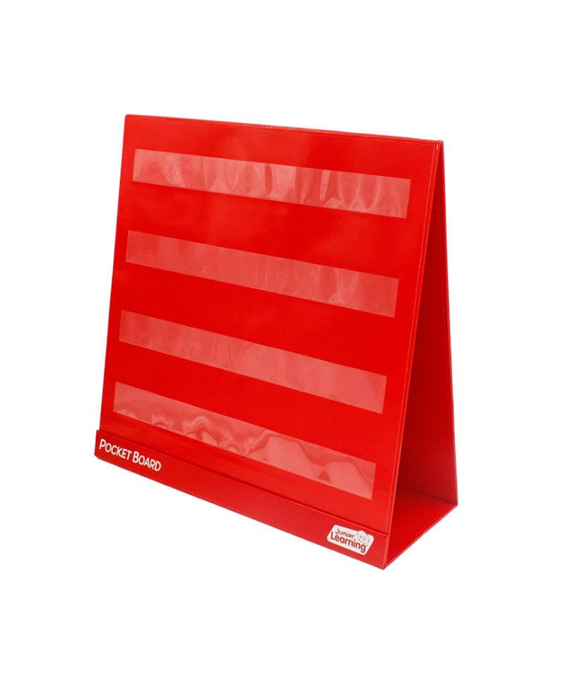 The pocket board by Junior Learning is a double-sided tent shaped board with pockets on the front and a large write and wipe magnet board on the back. Perfect for supporting lessons, the pockets can accommodate readers, flashcards or activity cards. On the back, the whiteboard supports magnetic manipulates or writing / drawing examples. The board itself measures 42 X 105cm which is effective for whole class, small group or individual learning.