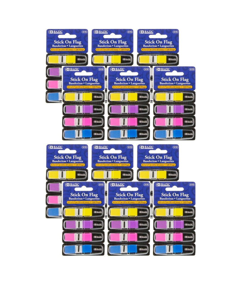 Self-stick flags adheres securely and allows repositioning with ease. Durable material prevents wear and tear from repeated handling and use. Features durable perforated cardboard dispensers with plastic cover. Colors include: Neon Yellow, Neon Purple, Neon Pink and Neon Blue. Measures 0.5" x 1.7". Each dispenser includes 30 flags. Each pack includes 4 dispensers for a total of 120 flags per pack. Sold as 12 packs for a total of 1440 flags.