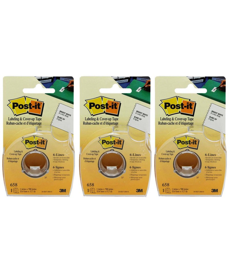 No one will ever know you goofed when you use Post-it Labeling and Cover-up Tape. It covers mistakes neatly, is easy to write on, and is virtually invisible on copies. 700-inch long roll is wide enough to cover six lines of standard-sized type. Each roll measures 1" x 700". Sold as 3 rolls.