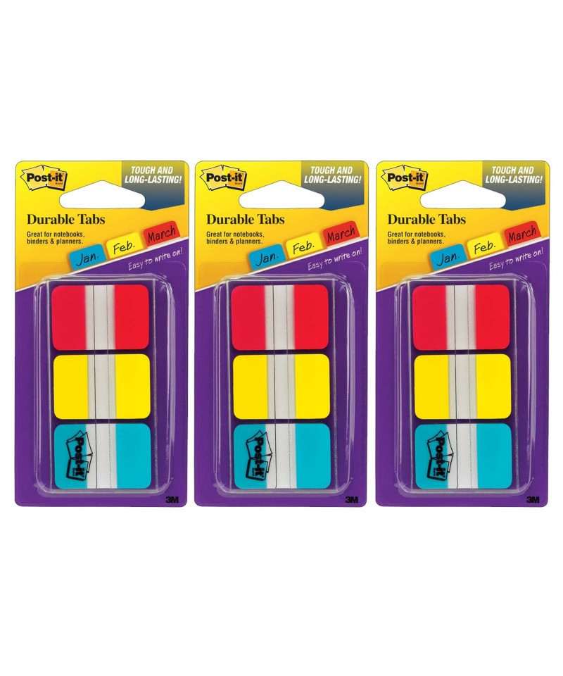 Post-it Tabs in 1" size create necessary order by easily organizing planners and calendars into sections. Solid color bars give you flexibility to organize by color. Tabs are durable, you can write on them, and reposition as needed. They are also great for binders and file folders. Tabs stick securely and remove cleanly. Red, Yellow and Blue. Contains 22 tabs per color and 66 tabs per on-the-go dispenser. Sold as a pack of 3 for a total of 198 tabs.