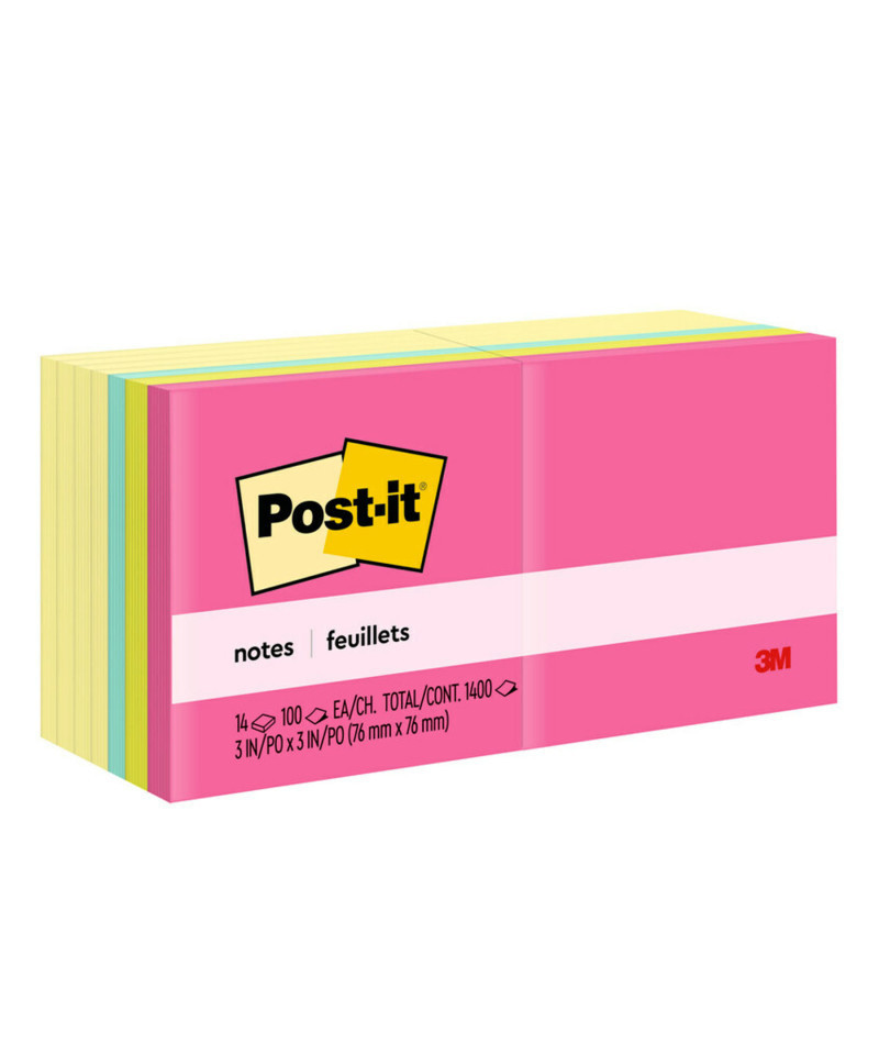 Post-it® Notes stick securely and remove cleanly, featuring a unique adhesive designed for use on paper. America's #1 favorite sticky note, the 3 in. x 3 in. size is great to call out important information or leave notes in calendars or planners. Canary Yellow color helps your note break through. Post-it® Notes are recyclable, and the paper in Post-it® Notes is sourced from certified, renewable and responsibly managed forests. Each pad includes 100 sheets. Each pack includes 14 pads in canary and Poptimistic collection colors.