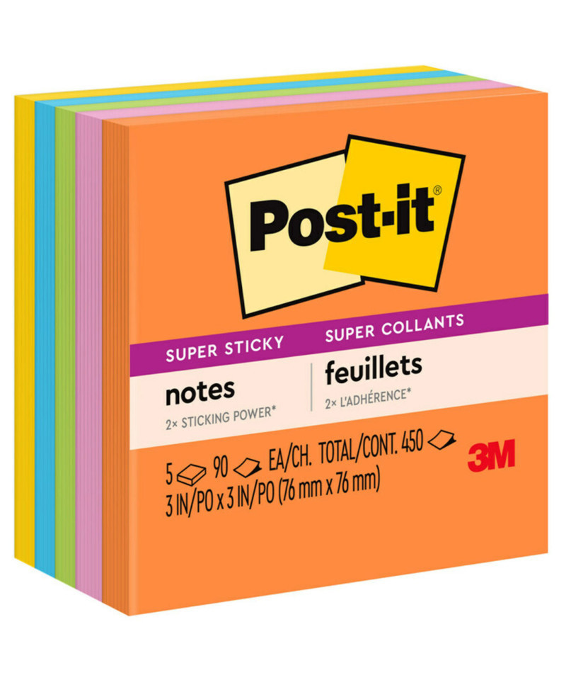 Post-it® Super Sticky Notes in 3 in x 3 in feature 2x the sticking power. Use for notes or reminders on doors, windows or walls. Unique adhesive reliably sticks and re sticks so your message can stay front and center. Move your notes with you throughout the day. Vibrant, spirited colors brighten your mood and messages in the Energy Boost collection. Post-it® Super Sticky Notes are recyclable and the paper in Post-it® Super Sticky Notes is sourced from certified, renewable and responsibly managed forests. 5 Pads/Pack, 90 Sheets/Pad.
