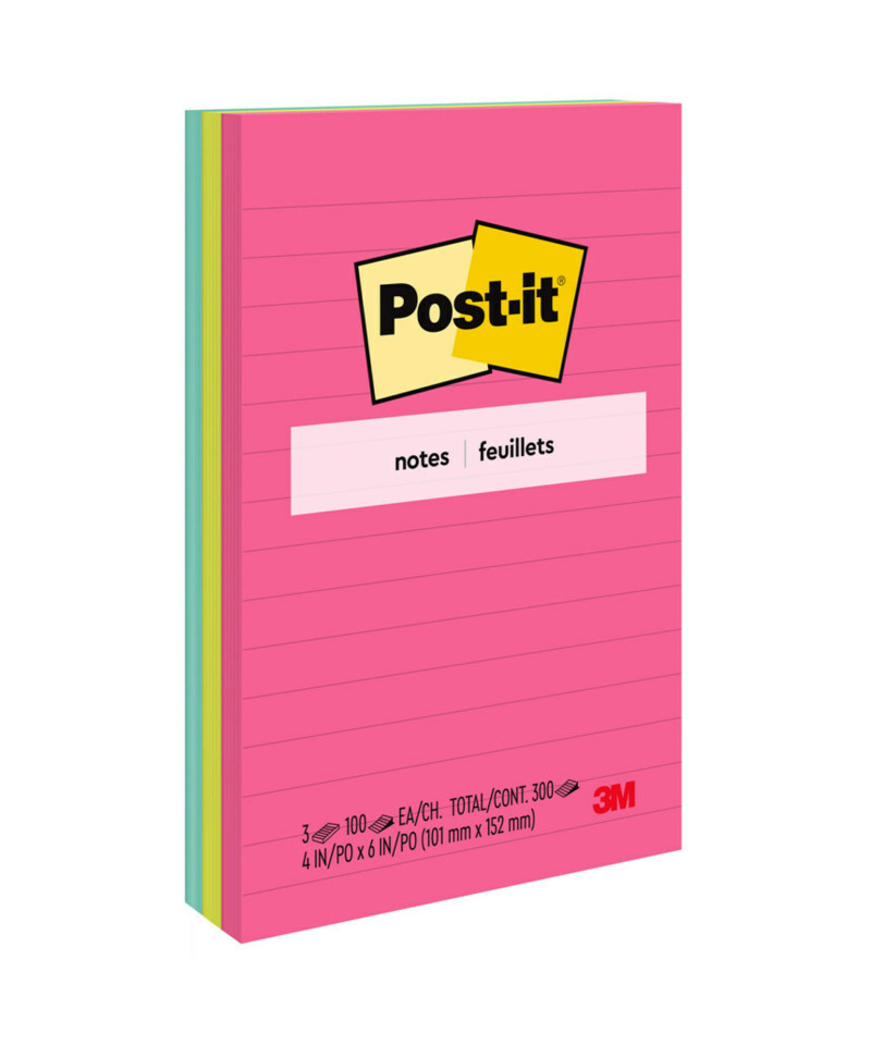 Post-it® Notes stick securely and remove cleanly, featuring a unique adhesive designed for use on paper. 4 in. x 6 in. size is great for to do lists in calendars or planners. The Poptimistic collection gives your messages pop and optimism with bright colors that grab attention. Post-it® Notes are recyclable, and the paper in Post-it® Notes is sourced from certified, renewable and responsibly managed forests. 3 Pads/Pack, 100 Sheets/Pad