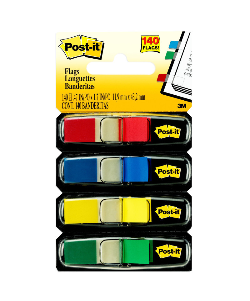 Find it fast with Post it® Flags in primary eye-catching colors that get noticed (red, yellow, blue and green). They make it simple to mark or highlight important information in textbooks, calendars, notebooks, planners and more. They stick securely, remove cleanly and come in a wide variety of colors. Draw attention to critical items that need attention. Use them to index, file or color code your work, either at home, in the office or in the classroom. This pack contains .47 in., 35 per Dispenser, 4 Dispensers/Pack.