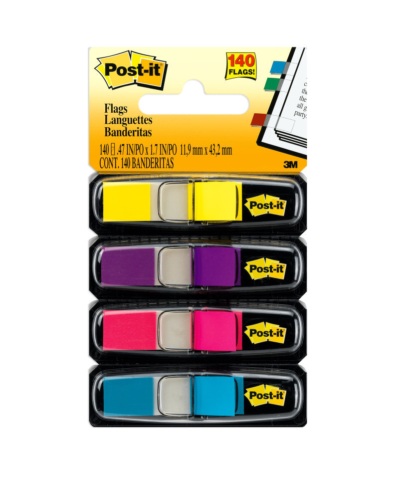 Post it® Highlighting Flags in assorted Bright colors and .47 in. wide size saves you from missing an important detail or item. Strong adhesive makes flags stay put and lets you reposition them as well. The dispenser makes one handed dispensing easy to help keep you on track. Contains 35/dispenser and 4 dispensers/pack.