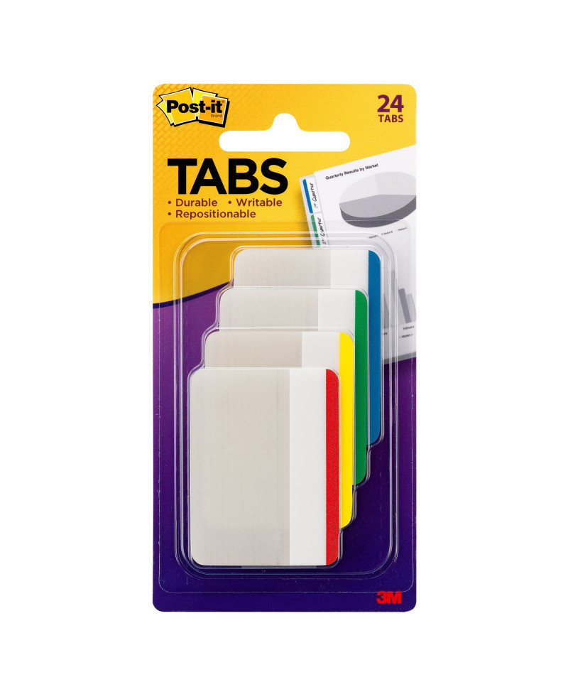 Post it® Tabs in 2 inch size create necessary order by easily organizing file folders. Lined color bars give you flexibility to organize by color. They are durable, you can write on them, and reposition as needed. They are also great for planners, notebooks and file folders. They stick securely and remove cleanly. Assorted primary colors. Contains 6 tabs/color, 4 colors, 24 tabs/pack.