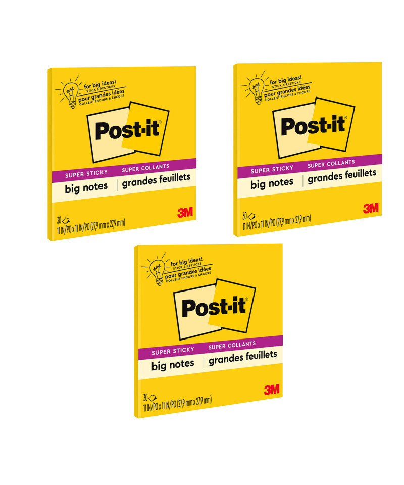 Think Big! Ignite your creativity with Post-it® Super Sticky Big Notes. These bright and colorful pads are designed to help you visualize your ideas with sheets that can be displayed on smooth, vertical surfaces. Large in size, yet easily portable. Use Post-it® Super Sticky Big Notes to bring your big ideas to life. Sheets measure 11" x 11". Each pad has 30 self stick sheets. Sold as a pack of 3 pads.