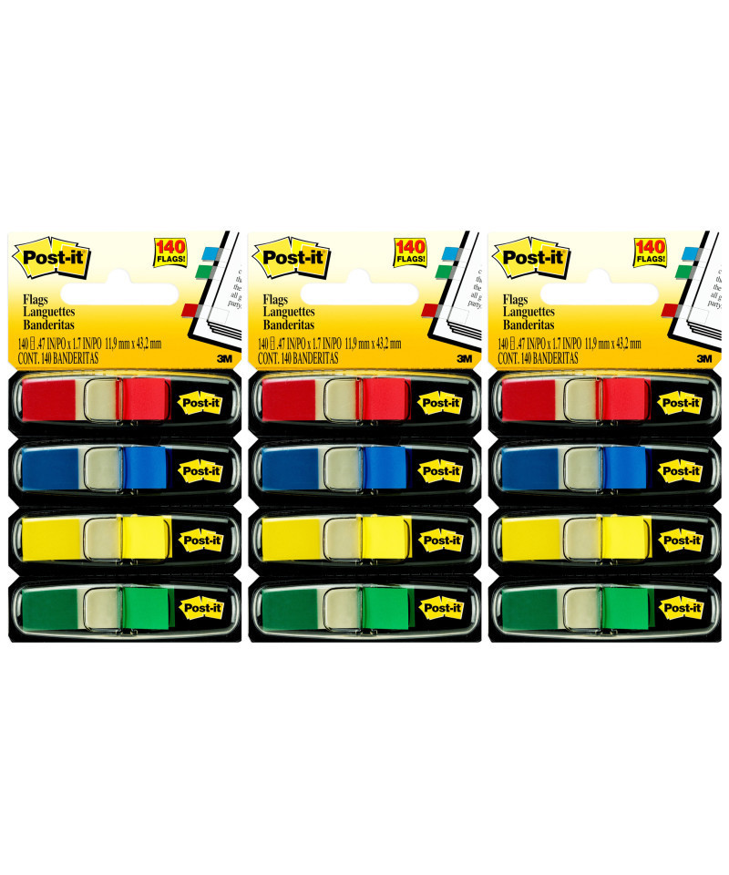 Find it fast with Post it® Flags in primary eye-catching colors that get noticed (red, yellow, blue and green). They make it simple to mark or highlight important information in textbooks, calendars, notebooks, planners and more. They stick securely, remove cleanly and come in a wide variety of colors. Draw attention to critical items that need attention. Use them to index, file or color code your work, either at home, in the office or in the classroom. Flags measure .47 in. Each pack includes 4 dispensers (35 flags/dispenser). Sold as 3 packs for a total of 12 dispensers (420 flags).