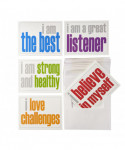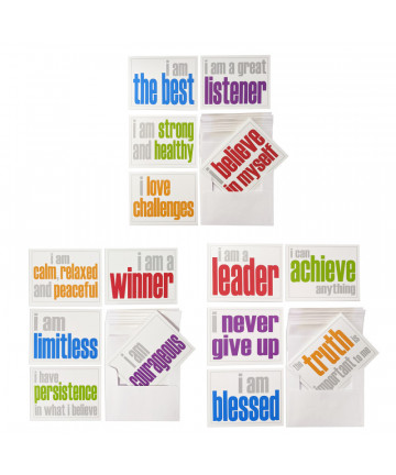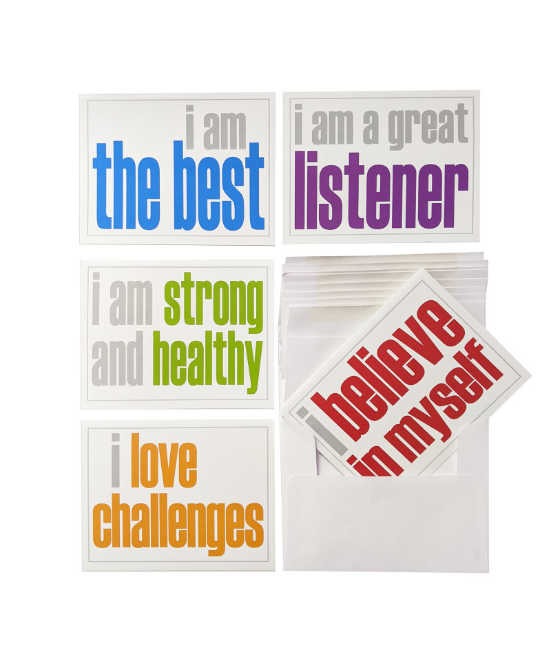 This Inspired Minds Positivity Booster Set consists of 10 Note Cards with Envelopes. There are 5 statements intentionally printed simple, yet colorful, to offer an impactful and creative way to help gain positivity and build character to last a lifetime. Make someone's day...and your day too, by sending an uplifting personal message inside these 5-1/2" x 4-1/4" blank note cards. Each set includes 10 note cards with envelope, 2 each of the 5 titles that match all Positivity Booster Sets.