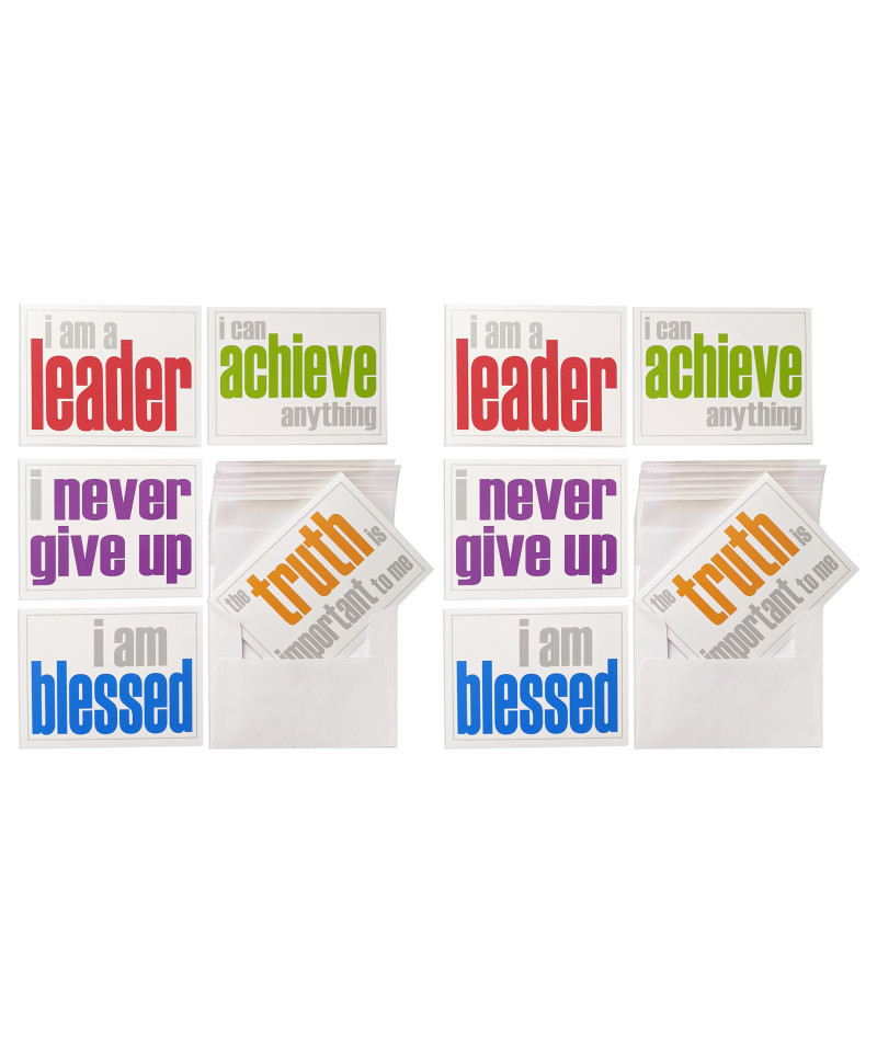 Each Inspired Minds Encouragement Booster Set consists of 10 Note Cards with Envelopes. There are 5 statements intentionally printed simple, yet colorful, to offer an impactful and creative way to help gain encouragement and build character to last a lifetime. Make someone's day...and your day too, by sending an uplifting personal message inside these 5-1/2" x 4-1/4" blank note cards. Each set includes 10 note cards with envelope, 2 each of the 5 titles that match all Encouragement Booster Sets. Sold as 2 sets for a total of 20 note cards with envelopes.