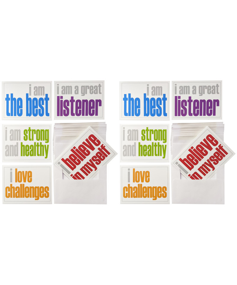 Each Inspired Minds Positivity Booster Set consists of 10 Note Cards with Envelopes. There are 5 statements intentionally printed simple, yet colorful, to offer an impactful and creative way to help gain positivity and build character to last a lifetime. Make someone's day...and your day too, by sending an uplifting personal message inside these 5-1/2" x 4-1/4" blank note cards. Each set includes 10 note cards with envelope, 2 each of the 5 titles that match all Positivity Booster Sets. Sold as 2 sets for a total of 20 note cards with envelopes.