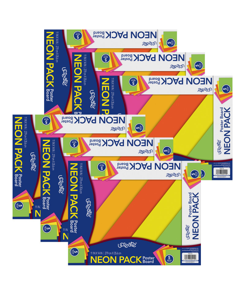 Convenient packaged poster board is ideal for posters, signs, displays, and art projects. Five color Neon assortment includes Neon Pink, Neon Green, Neon Orange, Neon Red and Neon Yellow. Recyclable. Measures 11" x 14". Each pack includes 5 sheets. Sold as 6 packs for a total of 30 sheets.