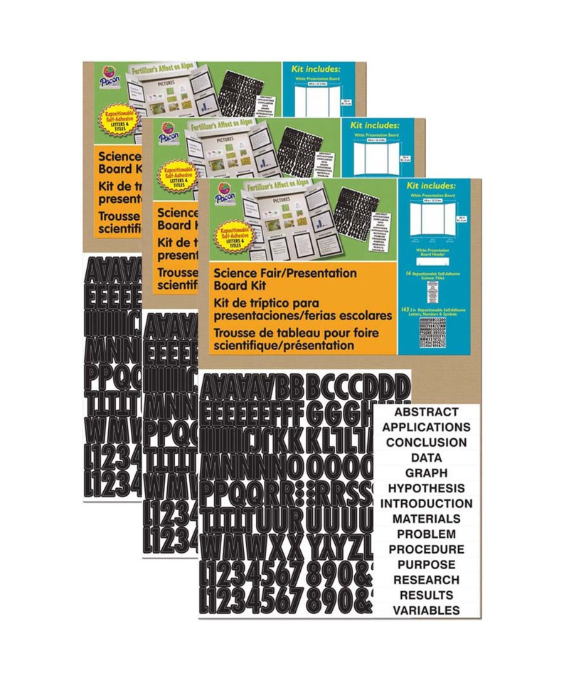 - Kit includes: 48"X36" presentation board, one white 36"X9 1/2" corrugated header, 143 self-adhesive and reusable black letters, numbers and symbols and 14 self-adhesive science titles