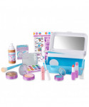 - Includes empty "foundation" pump bottle, compacts for pretend two-tone blush and powder, compact for pretend glitter, play lip gloss and 2 play lipsticks with removable caps, and 2 soft-bristled brushes (small for eyes, large for cheeks), 2 cloth makeup wipes in resealable pouch, reusable double-sided activity card; everything stores in durable, take-along makeup kit with built-in mirror