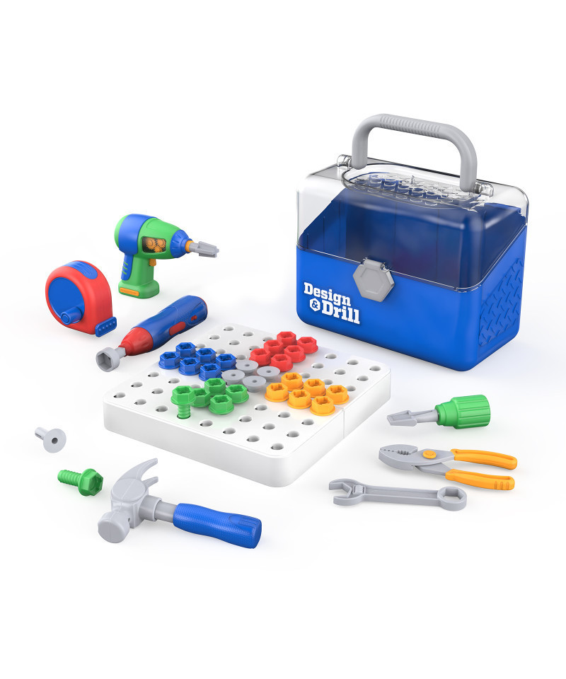 - Little builders can drill, hammer, measure, and more with the Design & Drill Toolbox, packed with real, working tools kids can call their own