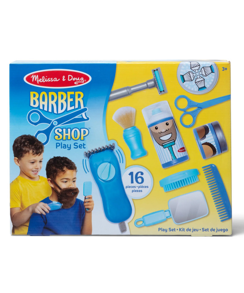 Cut, trim, shave, and style with pretend play shaving essentials for a trip to the barber! Style and pretend to trim a soft, wearable beard with adjustable straps. For a traditional shave, swirl squishy, textured shaving cream in a tub with a soft-bristled brush to pretend to lather up, then trim with play scissors. For a more modern shave, there's a pump shaving cream can, trimmers that vibrate when the tab is pulled (no batteries required) and a rolling razor for a "smooth finish." Kids can check their look in the hand mirror that flips to stand as they finish with textured pomade in a tub, comb, and brush. Includes a reusable double-sided activity card. Engaging, pretend-play fun allows both boys and girls three and older to play the barber or the customer! Everything stores in a sturdy zippered shaving kit for easy cleanup.